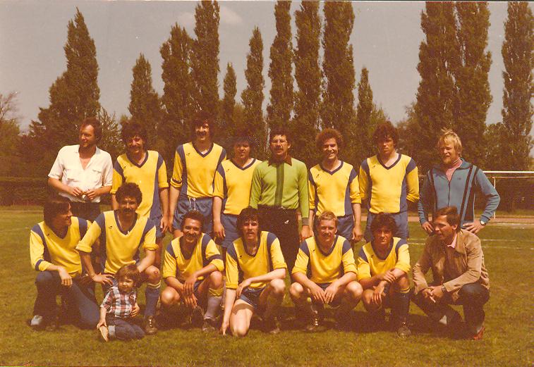 Stehend von links nach rechts: Dieter Grabow, Tünnes, Rainer Koopmann, Peter Schrader, Peter Zucker, Klaus Breuer, Wolgang Hamster, Dieter Hartmann (Trainer)